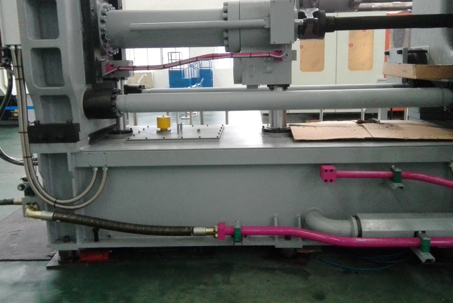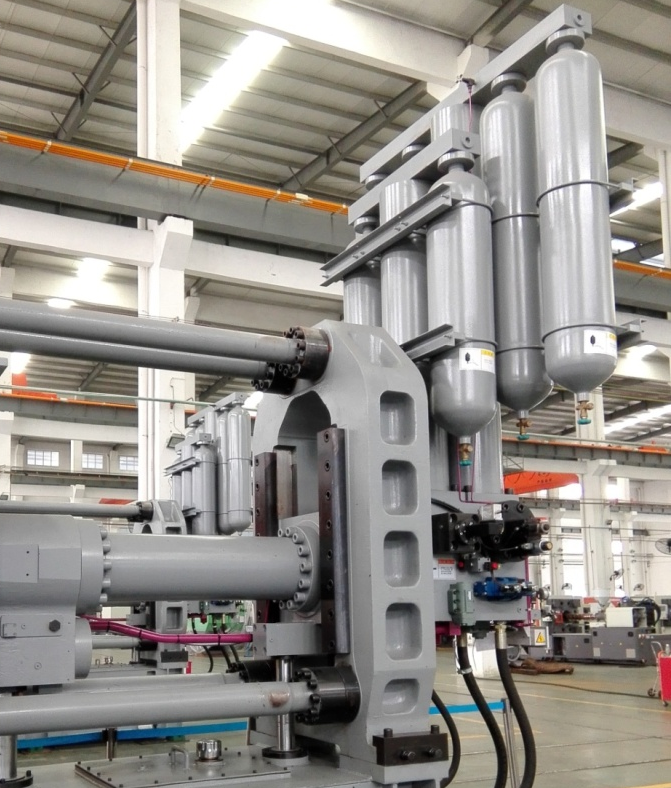 ①壓射系統(tǒng):采用儲能器容量加大型設(shè)計,強化系統(tǒng)壓射性能,減少系統(tǒng)壓降;配置更粗大的壓射系統(tǒng)油管,通流能力更強,響應(yīng)快速,且因壓力損失小,造成的油液升溫更小,能耗更低;拉桿加粗設(shè)計,確保剛性及模板平行度,增壓及壓射水平同向布局結(jié)構(gòu),提升壓射系統(tǒng)的穩(wěn)定性。